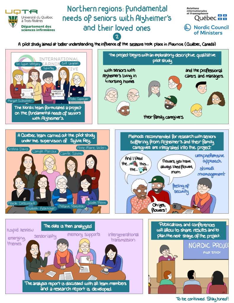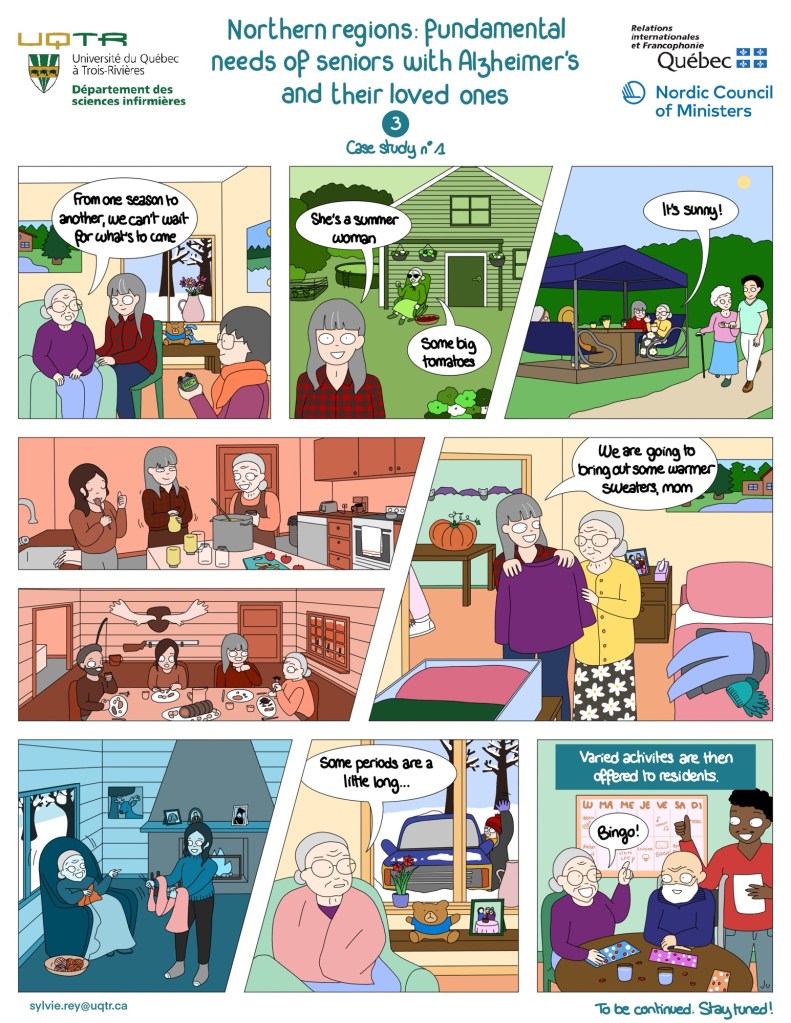 In 2024, I had the pleasure to work with Sylvie Rey, professor in nursing sciences from UQTR, and her team, on the creation of a cartoon on their research on the influence of seasons on elderlies living with Alzheimer in retirement homes. Here is the english version !